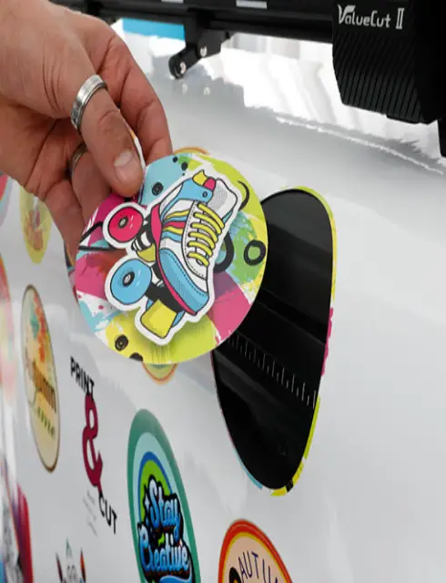 Teknik mencetak dan memotong stiker atau bahan lain yang desainnya telah dicetak, kemudian dipotong sesuai bentuk berpola yang diinginkan menggunakan mesin cutting plotter hanya sekali cetak.